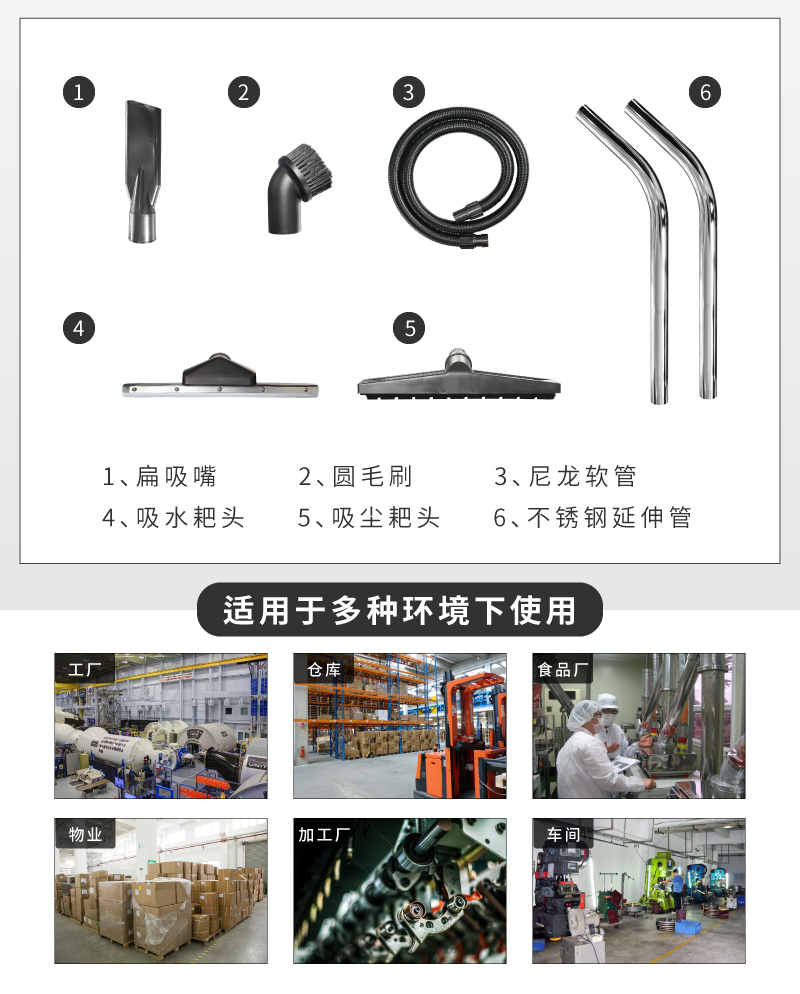 6.此款吸塵器適用于工廠,工地等地面的灰塵清理作業(yè),可吸塵吸水,吸油污、吸鐵屑,焊渣,小石子,灰塵,粉塵等。