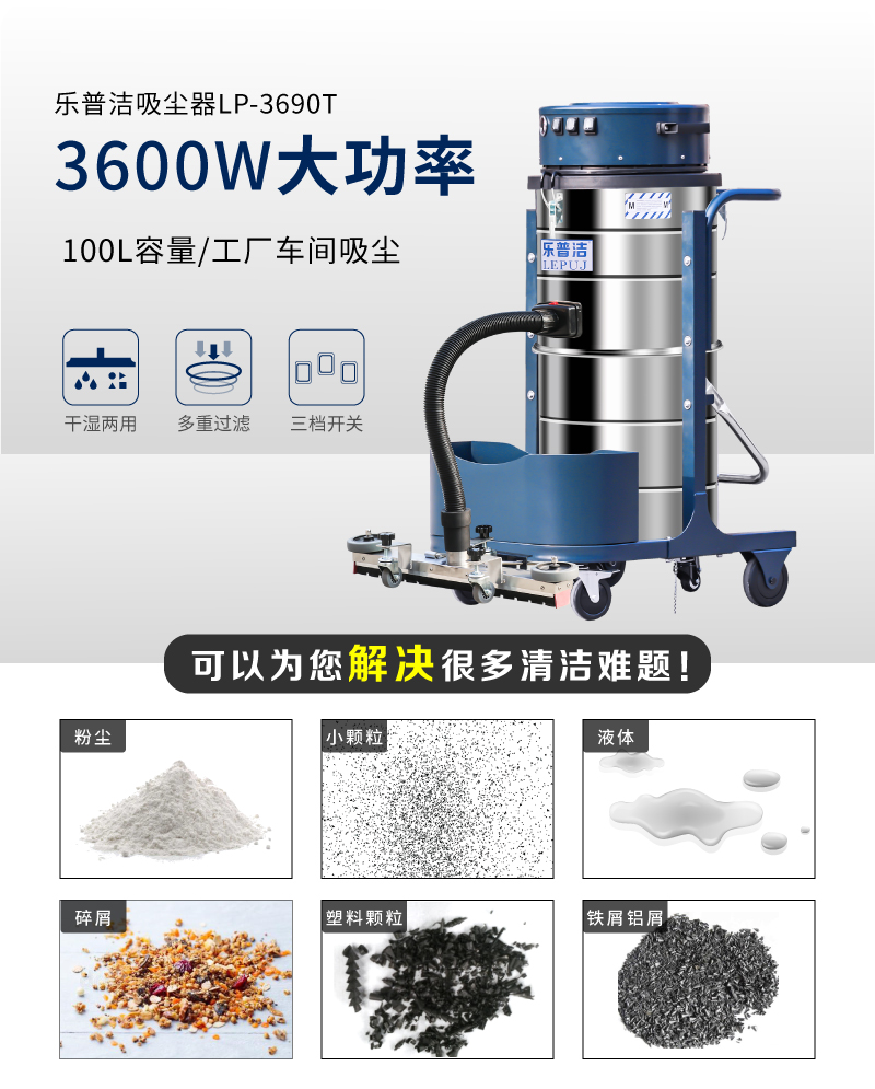 1.LP-3690T采用工業(yè)塑料設(shè)計(jì),三顆單獨(dú)吸塵電機(jī),根據(jù)所吸物品比重,吸力大小可以調(diào)節(jié)。